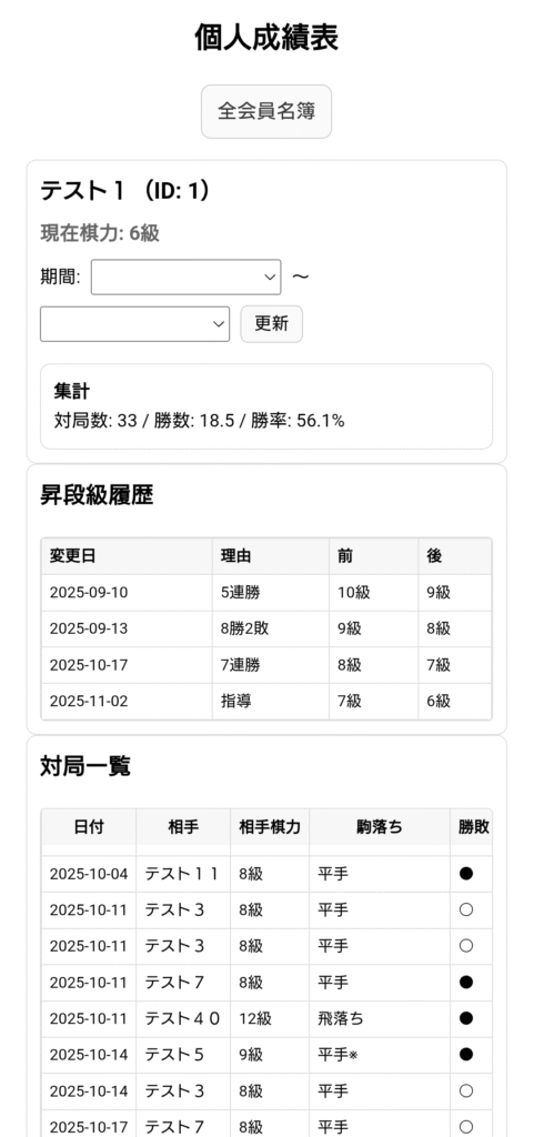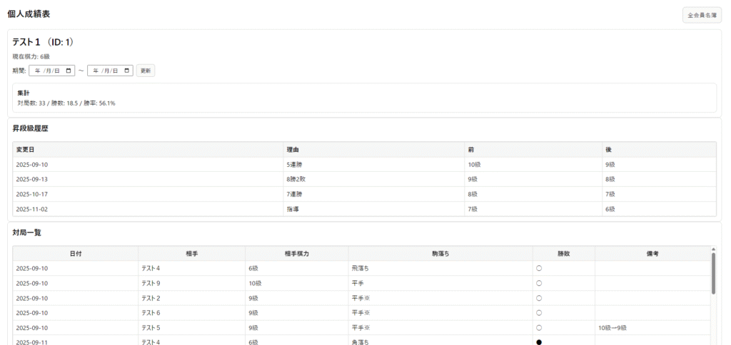 各会員の名前をクリックすると、個人成績を確認することができます。
