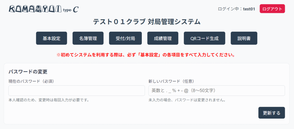 基本設定では、“KOMAYUI type-C”をあなたのクラブ・教室等で使用する上での段級位、駒落ち等の設定ができます。