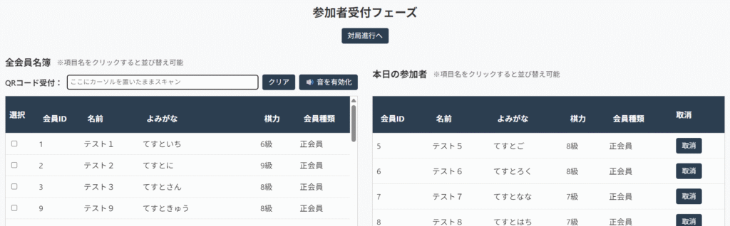 対局進行フェーズにおいて、QRコードリーダーにQRコードをかざすと、その会員が配置されている対局カード等の位置にスクロールし表示されます。