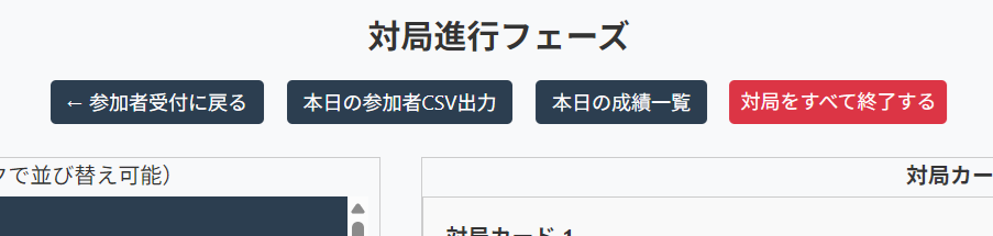 画面の左側には参加者受付フェーズで参加受付を行った「本日の参加者」が表示され、右側には「対局カード」が表示されます。