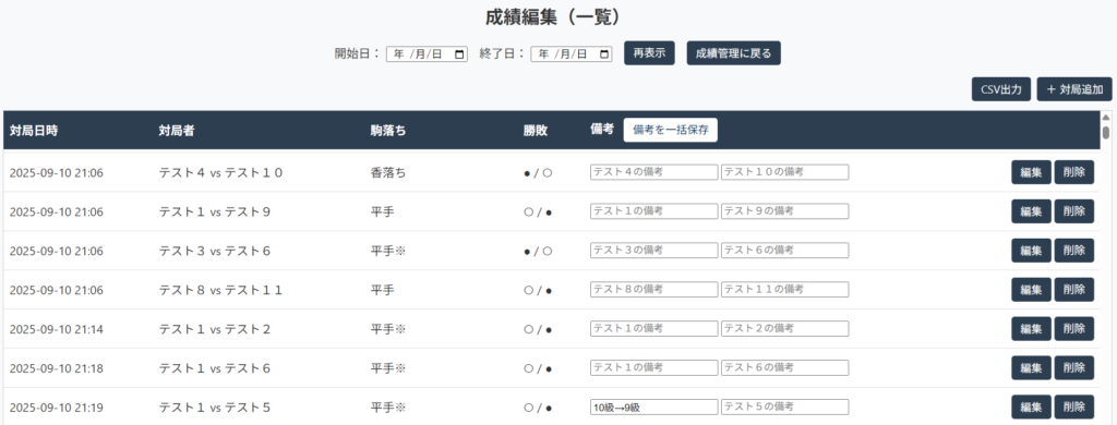 各対局者の備考欄の編集は画面右の「編集」ボタンを押さなくても、この画面から編集することもできます。(備考欄を編集後、項目行にある「備考を一括保存」を押下してください)