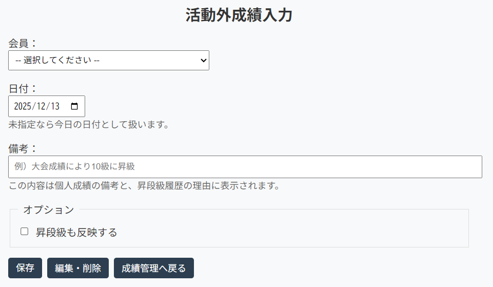 会員をプルダウンで選択し、昇段級の適用日、備考(「〇〇大会の成績により昇級」等)を記入してください。
